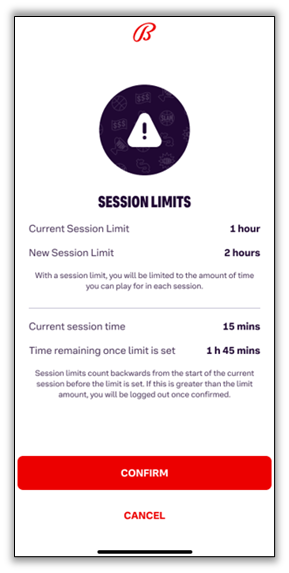 When you choose your desired Session Limit, you will be prompted to review and confirm your selection, which will be activated immediately upon clicking 'Confirm.' The limit takes effect as soon as you log in. For example, if you've already been logged in for 30 minutes and set a 1-hour session limit, you will have only 30 minutes left to play until the limit resets.